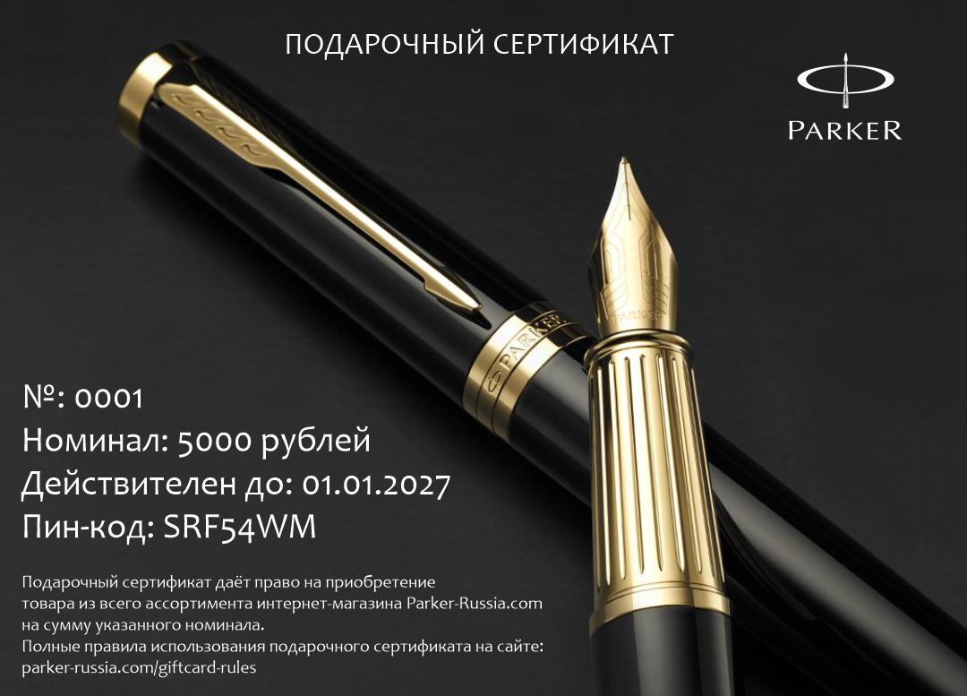 Подарочный сертификат Parker 5000 от официального дилера Parker в Бердске. Вы можете дополнительно заказать гравировку, которая подчеркнет Вашу оригинальность и придаст памятность статусному подарку. Все ручки Паркер поставляются в фирменном футляре.